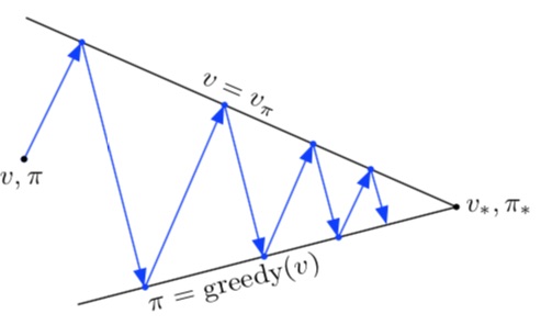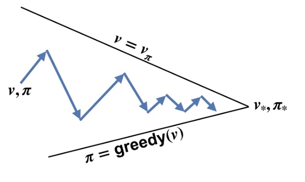 Podemos hacer las dos cosas anteriores de manera que iniciando con una política dada podemos obtener su función de valor, y después generar una política mejor, luego obtener su función de valor correspondiente y volver a empezar hasta que la política enésima ya no cambie.