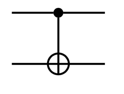 Esto significa que el valor del segundo cúbit se invierte si y solo si el valor del primer cúbit es . O, para decirlo en otras palabras, la aplicación de una compuerta NOT en el segundo qúbit (al que llamamos objetivo) está controlada por el primer qúbit. En un circuito cuántico, la compuerta CNOT se representa de la siguiente manera: