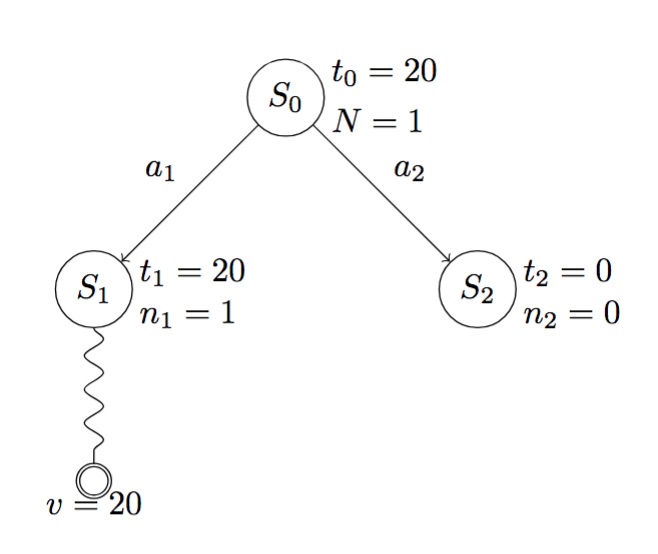 3. Simulación.(Rollout) Desde el nodo seleccionado, o desde uno de sus nodos secundarios recientemente agregados (si los hay), se ejecuta la simulación de un episodio completo con acciones seleccionadas por la política de rollout. El resultado es una prueba de Monte Carlo con acciones seleccionadas primero por la política de árbol y más allá del árbol por la política rollout.