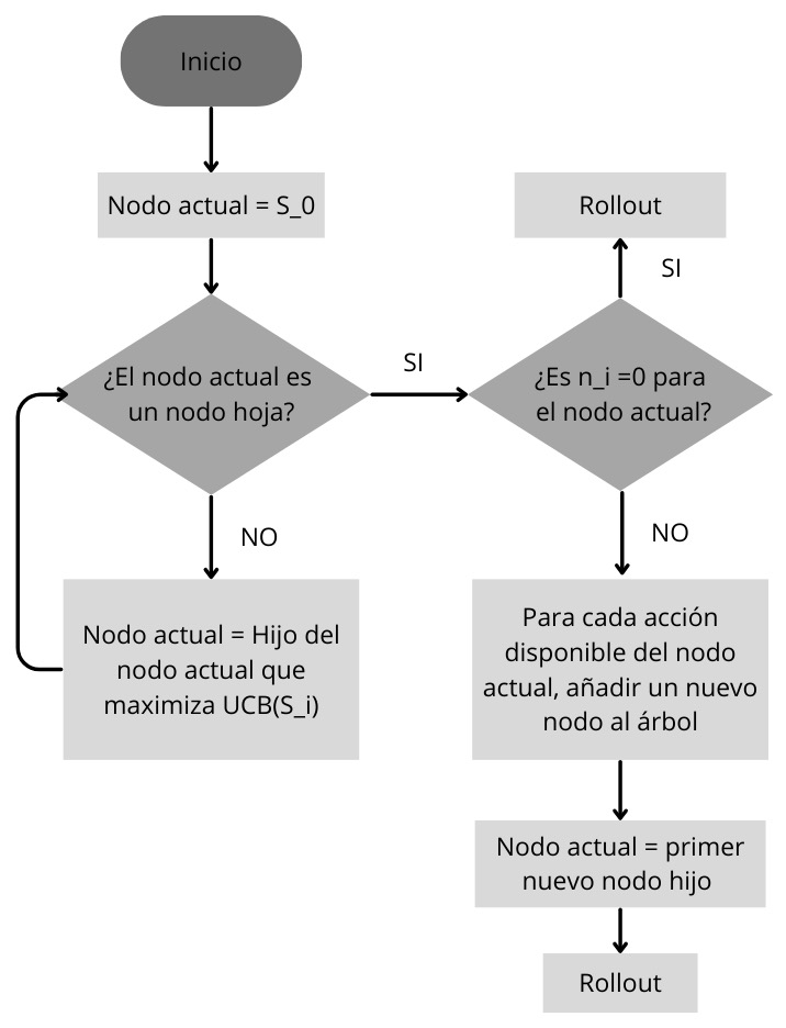 1. Selección. A partir del nodo raíz, una política de árbol basada en los valores de acción asociados a las aristas del árbol recorre el árbol para seleccionar un nodo hoja.